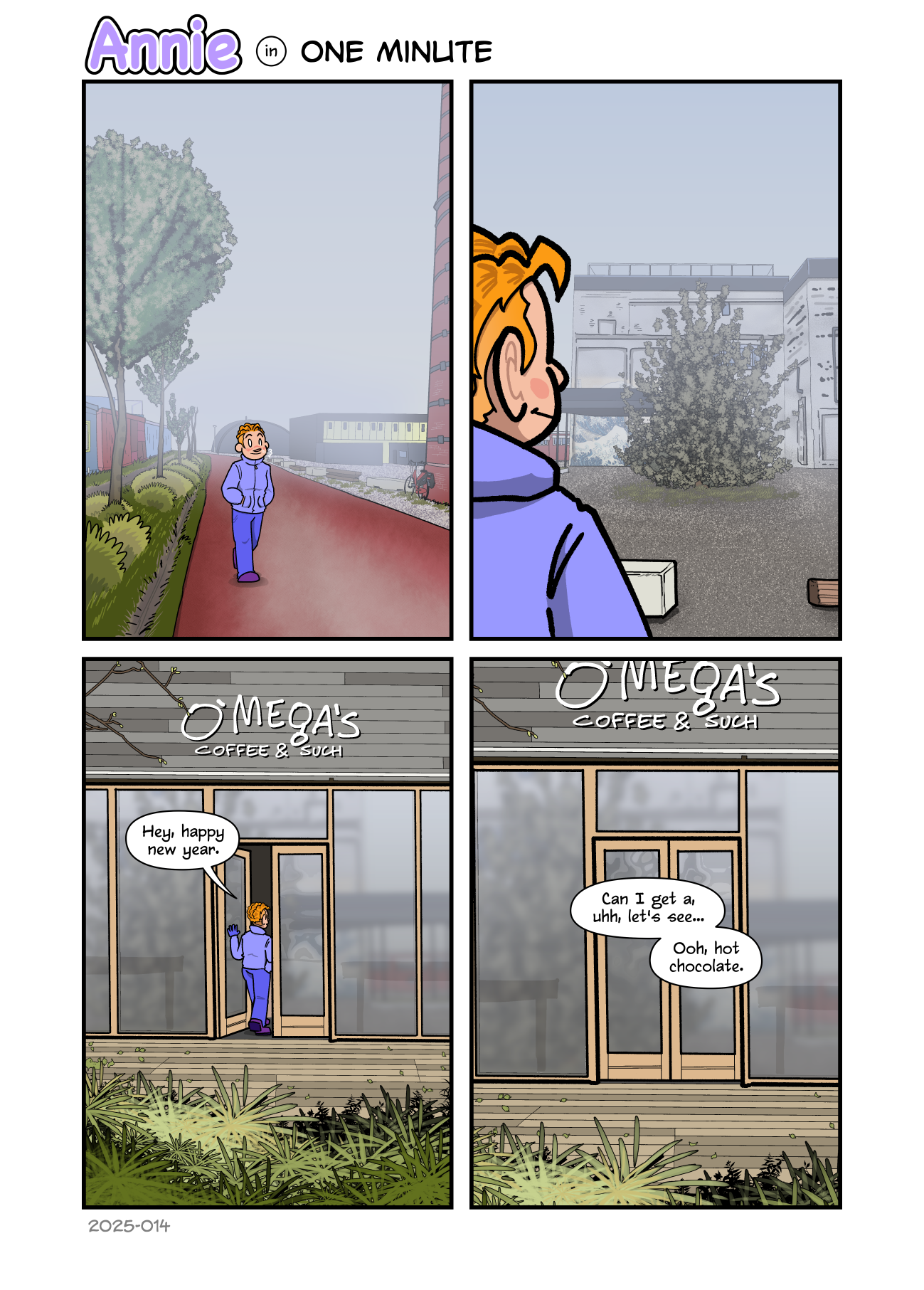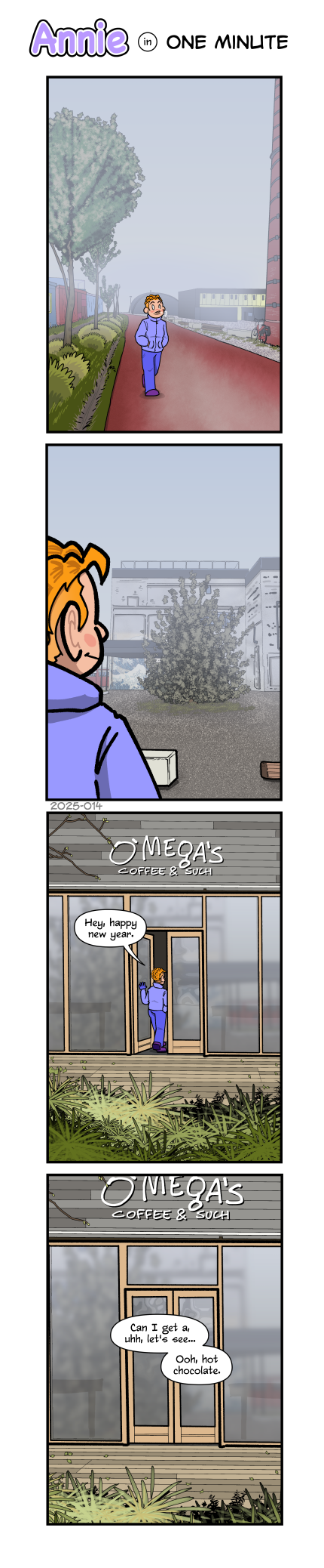 Fog sweeps the reclaimed industrial area. Bushes and trees line a neat but worn paved path. One tree, so unruly it might actually be a large bush, stands proudly and happily in the middle of the gravel area around an old factory building. Annie, whose bike is parked against a large red brick tower, walks the paved path with a smile on her face, which is blushing from the cold. She fondly considers the unruly tree, before entering O'Mega's Coffee & Such.
