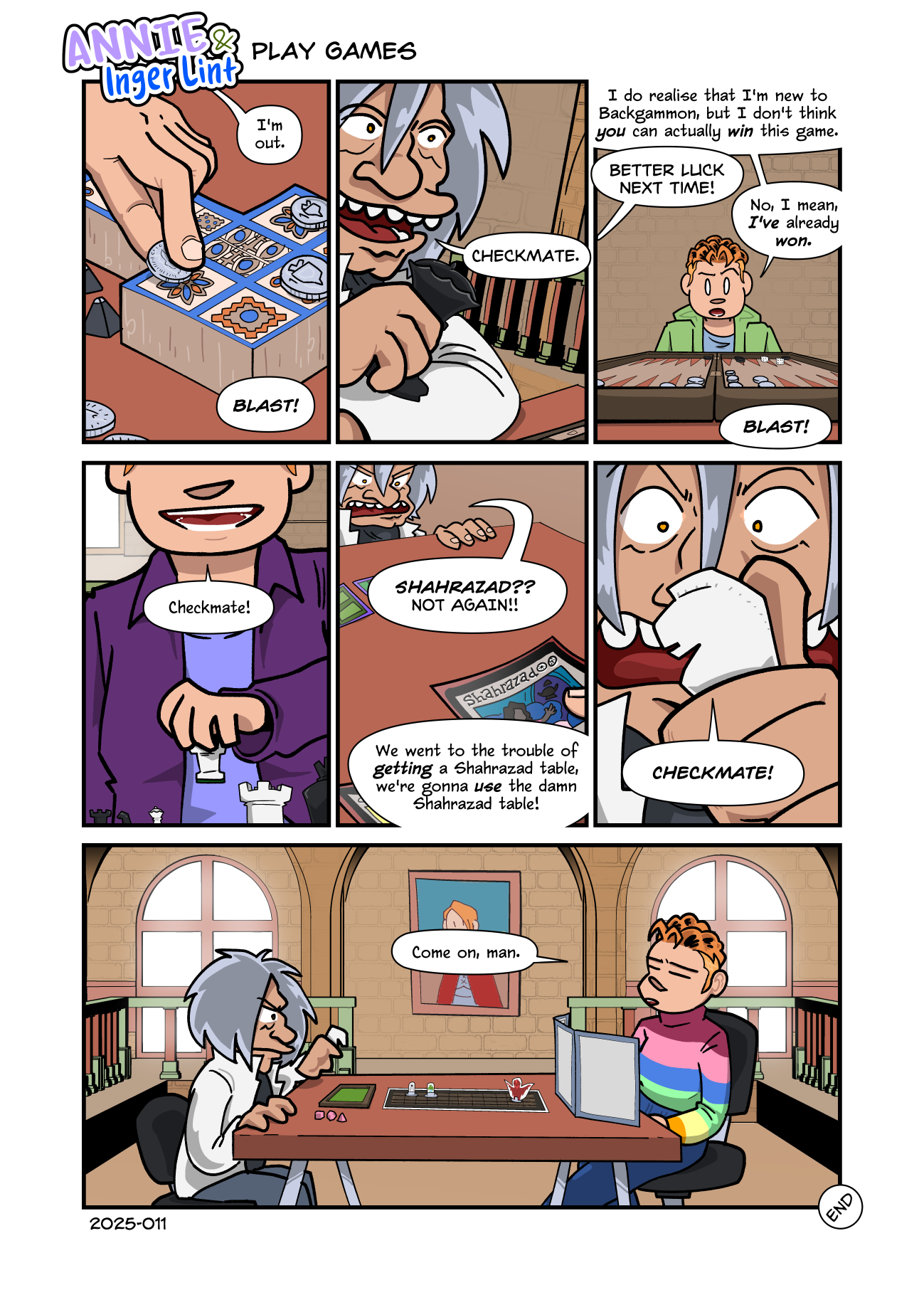 ”SHAHRAZAD?? NOT AGAIN!!” Inger Lint declares, watching Annie put down a copy of the Magic: The Gathering card Shahrazad, which for just two white mana makes players start an entire second game of Magic with the cards they have left in their deck.