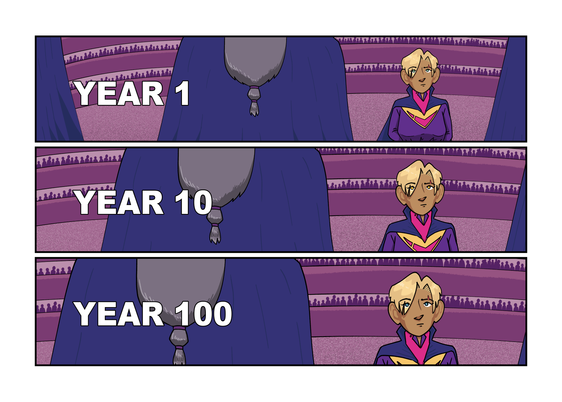 PANEL TWO: YEAR 10. In a purple arena, Juno Pike stands amongst the Visioneers, the world reflecting orange in her eyes.
