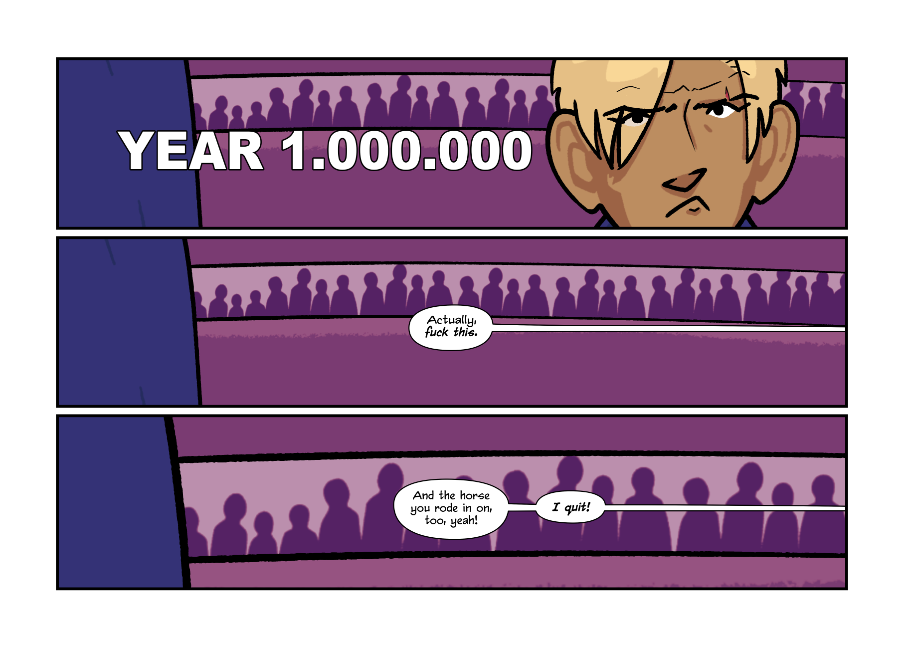 PANEL ONE: YEAR 1.000.000. In a purple arena, Juno Pike stands amongst the Visioneers, the world no longer reflecting in her furious eyes.