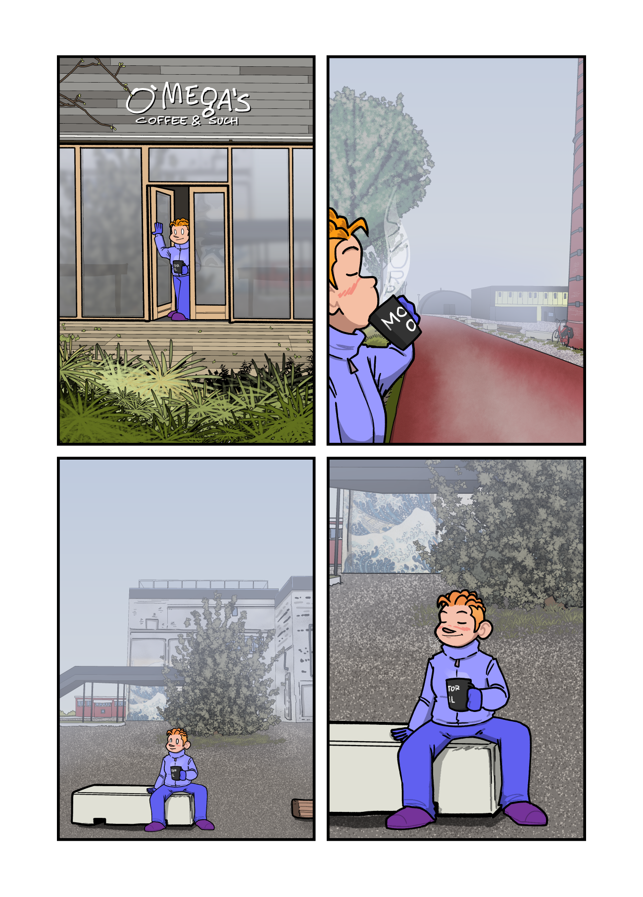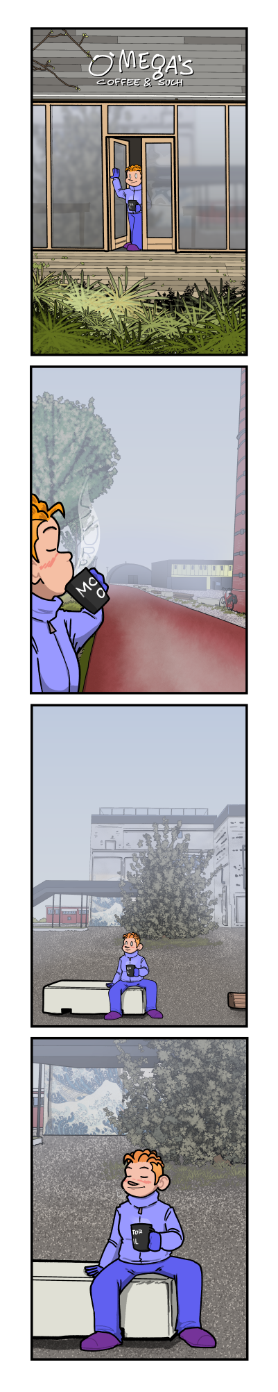 Annie exits O'Mega's Coffee & Such with a big, steaming mug of hot chocolate. She takes a big slurp of it as she crosses the paved path, and sits down on a stone block in front of the unruly tree. She closes her eyes and smiles, happily.