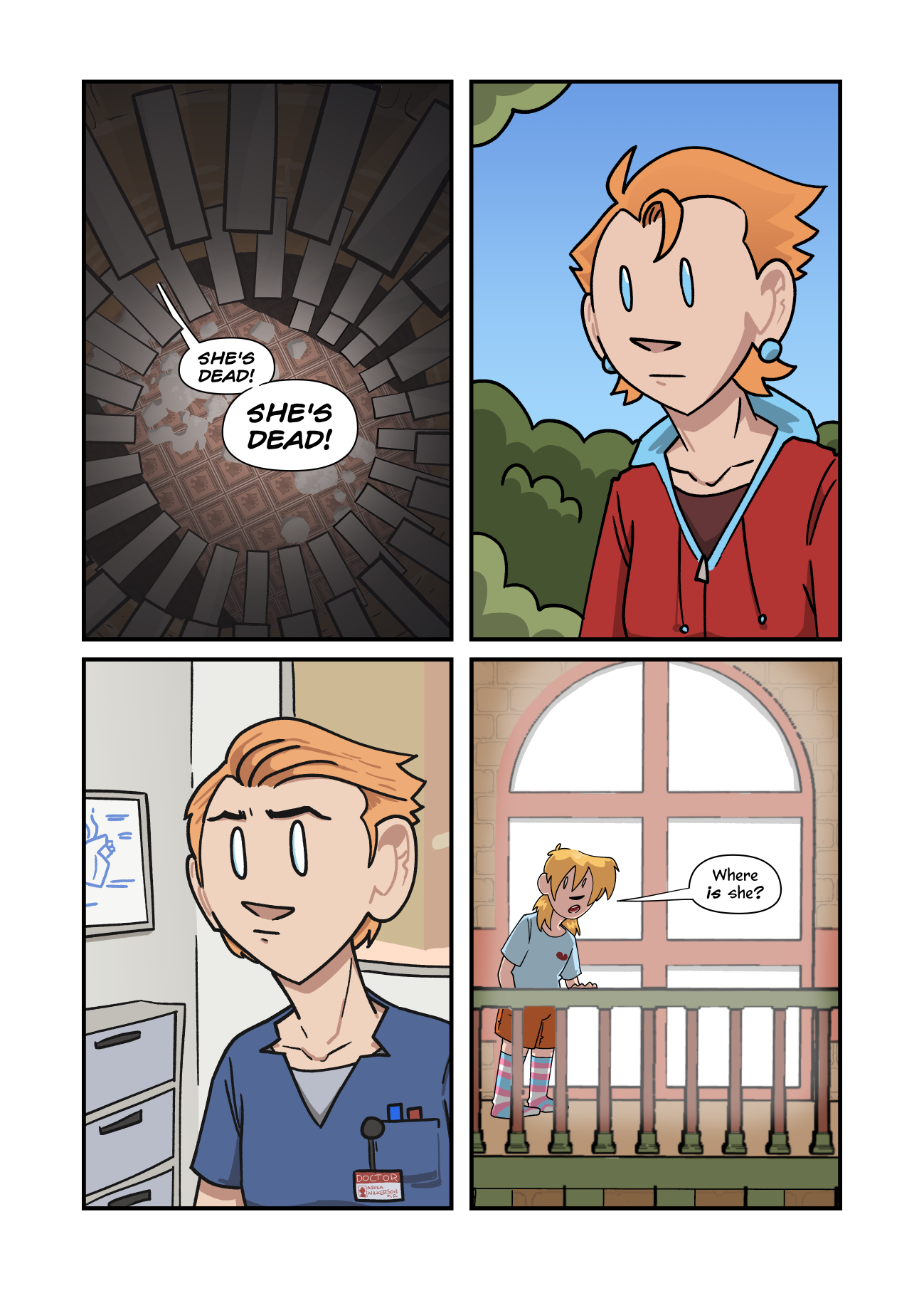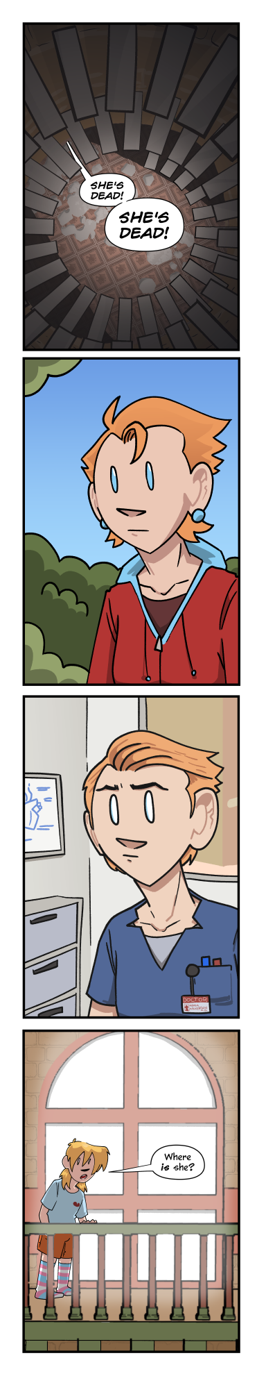 The voice of Inger Lint rings dramatically through the Castle’s circular staircase — “SHE’S DEAD! SHE’S DEAD!”Meanwhile, somewhere on the island, Aquila looks into the distance with a blank, blue-eyed expression on her face — while somewhere else, Aquila, her hair slicked back, wears a hospital uniform, a doctor’s badge, and a blank, white-eyed expression on her face.