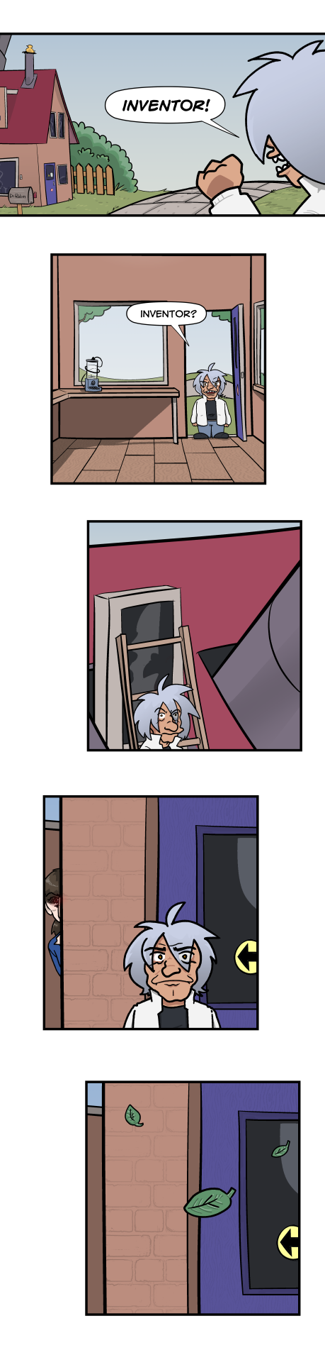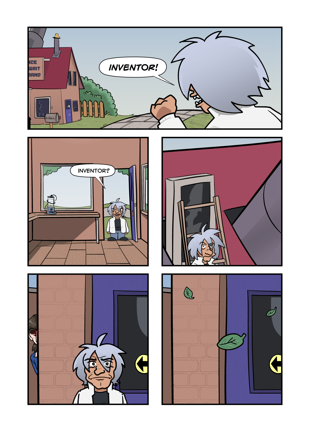 The voice of Inger Lint bellows across the path to Doc Robin’s lab. “INVENTOR!”Finding no inventor — “Inventor?” — Inger Lint wanders around the lab. No inventor on the roof. No inventor in front of the house.