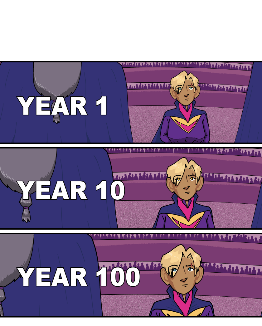 PANEL THREE: YEAR 100. In a purple arena, Juno Pike stands amongst the Visioneers. The world reflecting blue in her eyes.