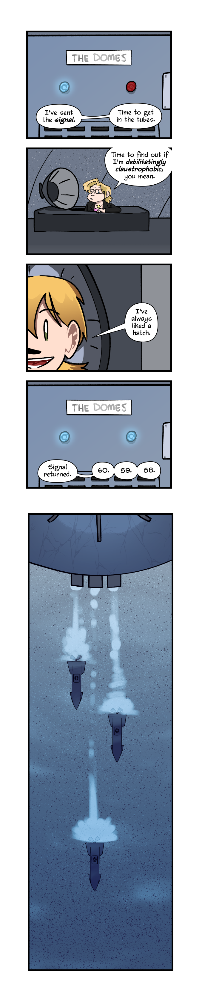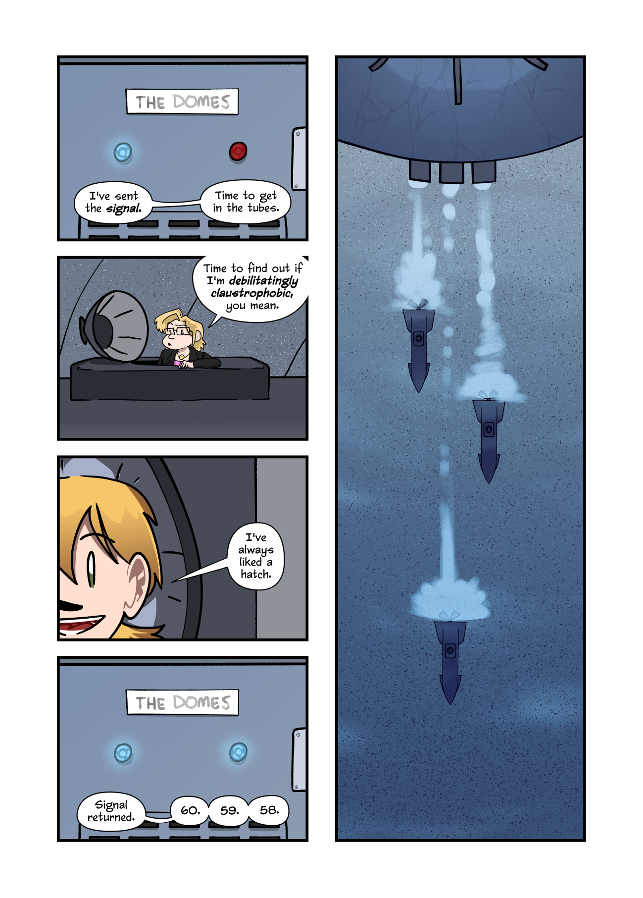 “I’ve sent the signal,” Aquila says, and indeed, one of two lights on the console burns a bright blue to indicate that she has. “Time to get in the tubes.”