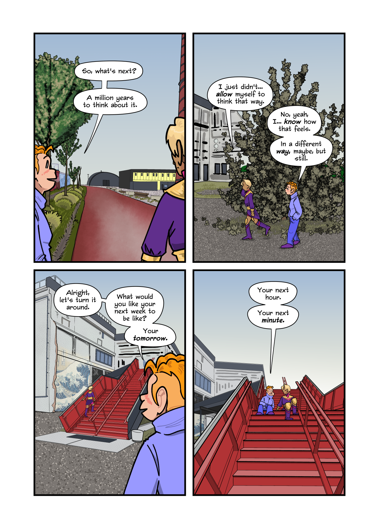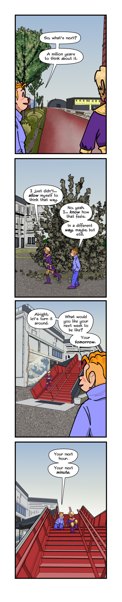 "No, yeah, I... know how that feels. In a different way, maybe, but still. Alright, let's turn it around. What would you like your next week to be like?" Annie says, as they walk to the red stairs in front of the old industrial building the tree is in front of. "Your tomorrow. Your next hour. Your next minute."
