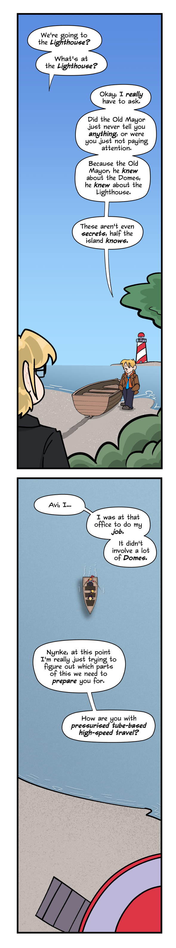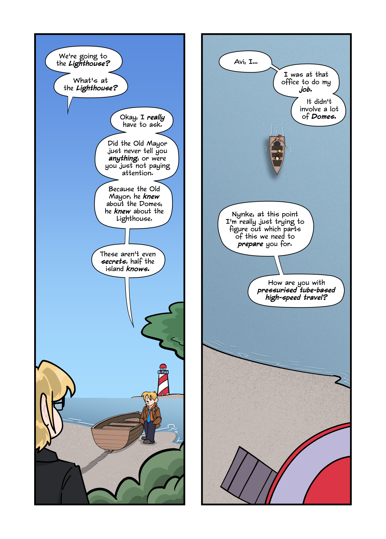 “Okay,” Avi says, “I really have to ask. Did the Old Mayor just never tell you anything, or were you just not paying attention. Because the Old Mayor, he knew about the Domes, he knew about the Lighthouse. These aren’t even secrets, half the Island knows.”