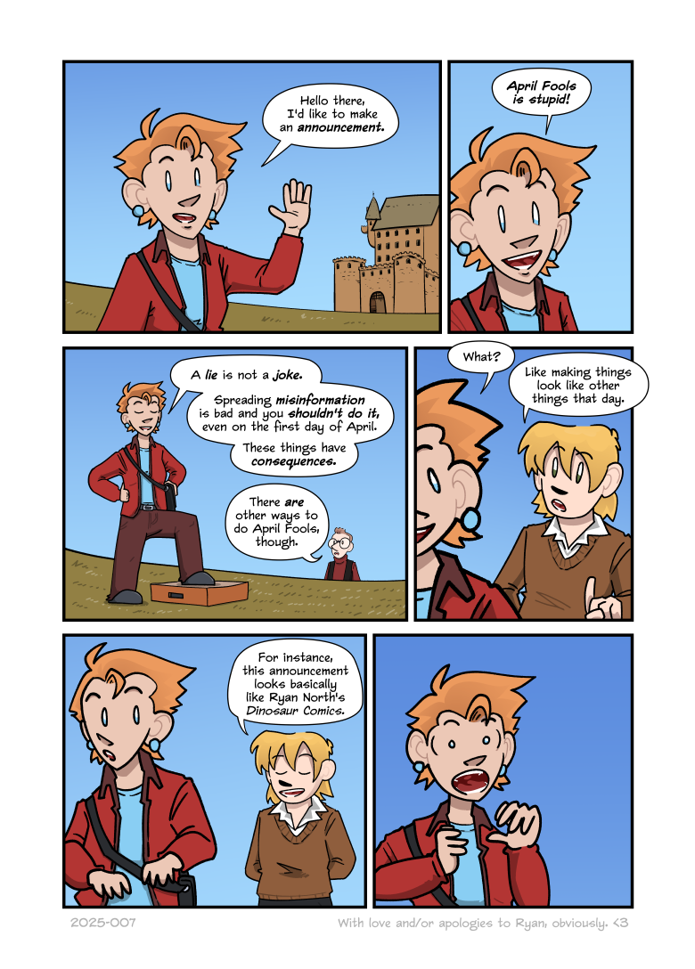 Avi contributes, “Like making things look like other things that day. For instance, this announcement looks basically like Ryan North’s Dinosaur Comics.”