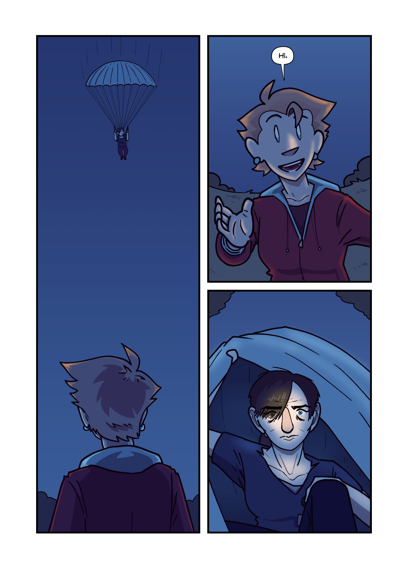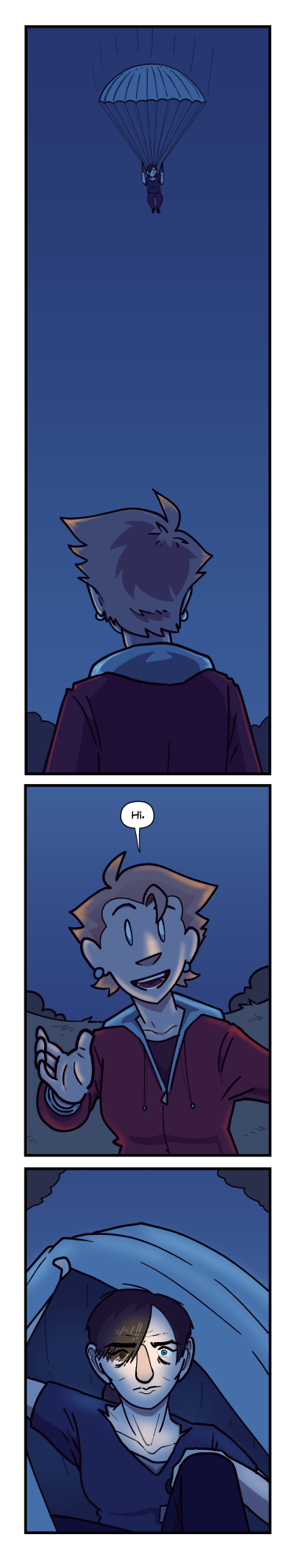 Aquila the Last Eagle watches as a figure held up by a parachute drops down into Nox Islia’s airspace at night. Coming up to them to greet them, she shares a chipper “Hi,” with a gentle wave.Coming out from under her parachute, the figure is a young woman, in a typical nursing uniform. Her hair, short in the front and in a tail in the back, is in a side part that covers her right eye, but not her left, which is bright blue. She has an intense expression on her face.