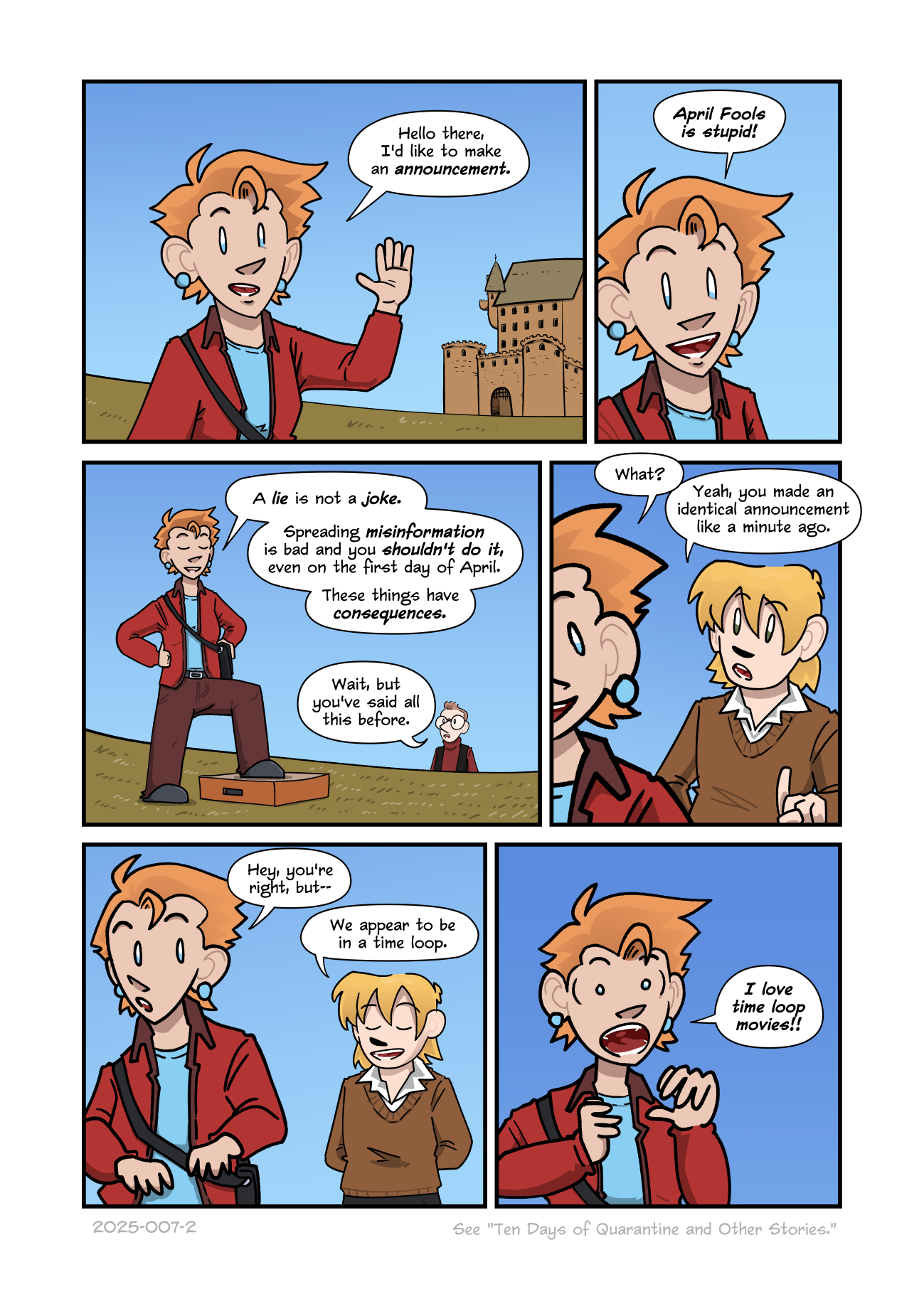 Aquila speaks directly to the camera. “Hello there, I’d like to make an announcement. April Fools is stupid!” She sets her foot down on an apple box, and confidently continues “A lie is not a joke. Spreading misinformation is bad, and you shouldn’t do it, even on the first day of April. These things have consequences.”Doc Robin chimes in from over the horizon. “Wait, but you've said all this before.”