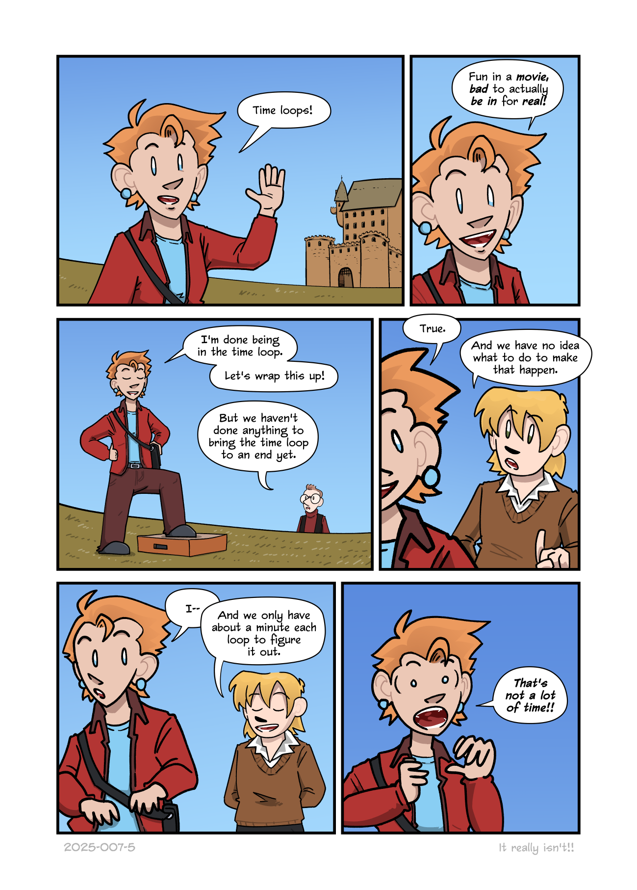 Aquila speaks directly to the camera. “Time loops! Fun in a movie, bad to actually be in for real!”Doc Robin chimes in from over the horizon. “But we haven't done anything to bring the time loop to an end yet.”